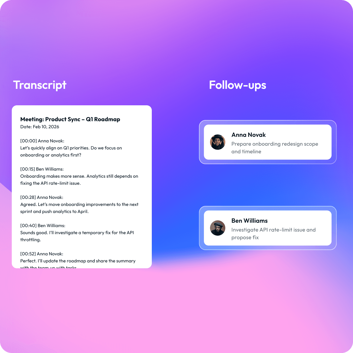 Automatically convert meeting recordings into structured summaries, evaluate key insights with AI, and deliver formatted updates to your team—without manual follow-ups.