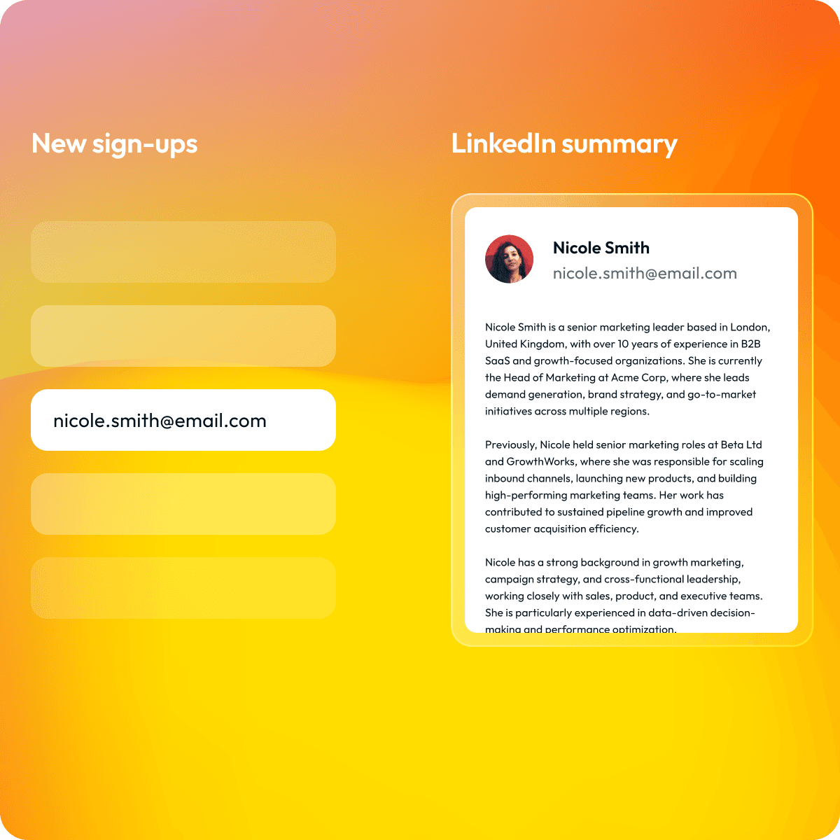 Turn raw email addresses into verified, enriched contact profiles by combining email validation with intelligent LinkedIn data matching.